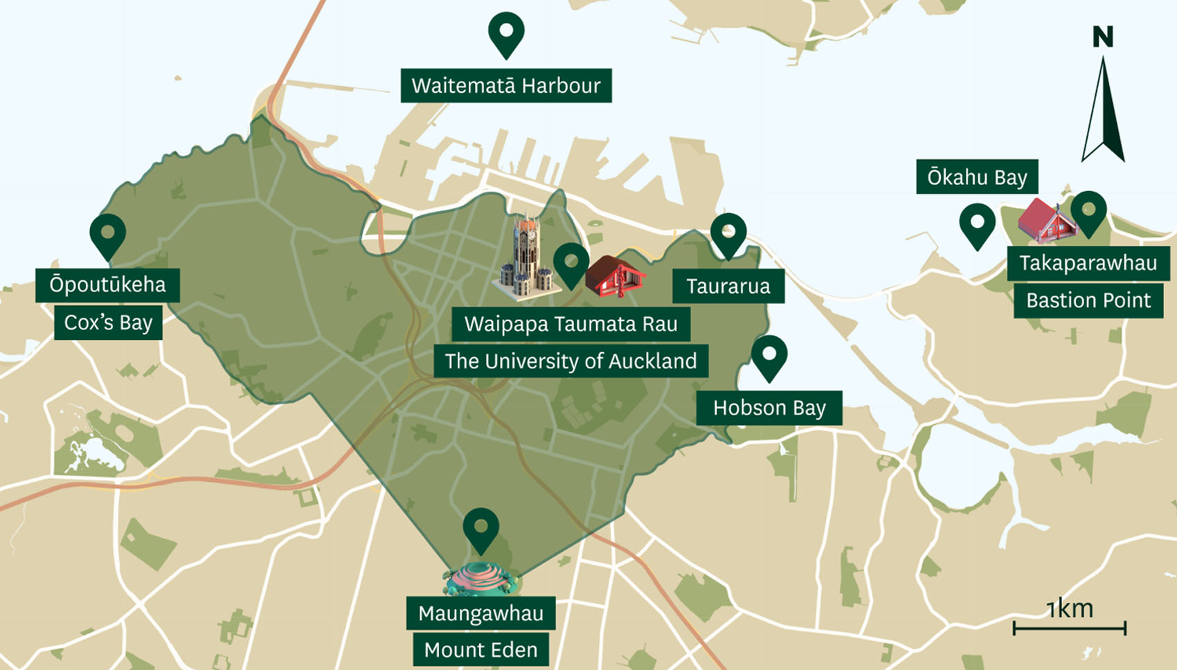 The University sits on the land that Te Kawau, Tīnana, and Rēwiti Tāmaki (Te Taoū o Ngāti Whātua leaders) provided the Crown in 1840. This land was part of the original tuku whenua, a chiefly gifting of about 3000 acres for a Pākehā settlement, to establish the capital city, and as the basis of a close relationship between Ngāti Whātua Ōrākei and Governor William Hobson as the Crown representative.